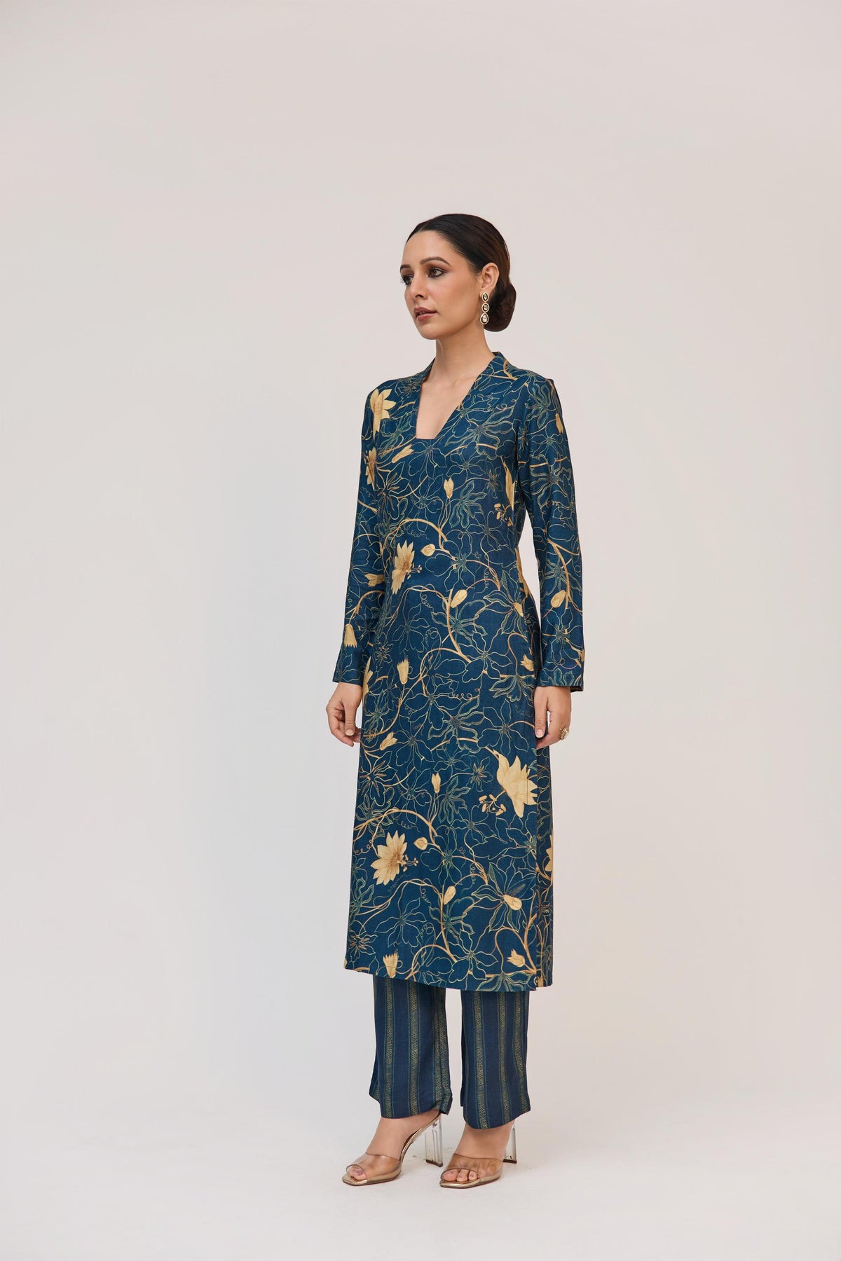 Crafted in royal blue bamboo cotton, this kurta set draws inspiration from the delicate geometry of the Krishna Kamal flower. The kurta features all-over digital prints echoing the bloom’s organic rhythm, paired with straight pants adorned in Krishna Kamal–inspired striped prints for a contemporary contrast. Completing the look, the sheer 35 gsm organza dupatta carries the same botanical story through digital prints and handmade tassel details, adding a touch of fluid elegance. Together, the set celebrates harmony in craft, print, and silhouette.