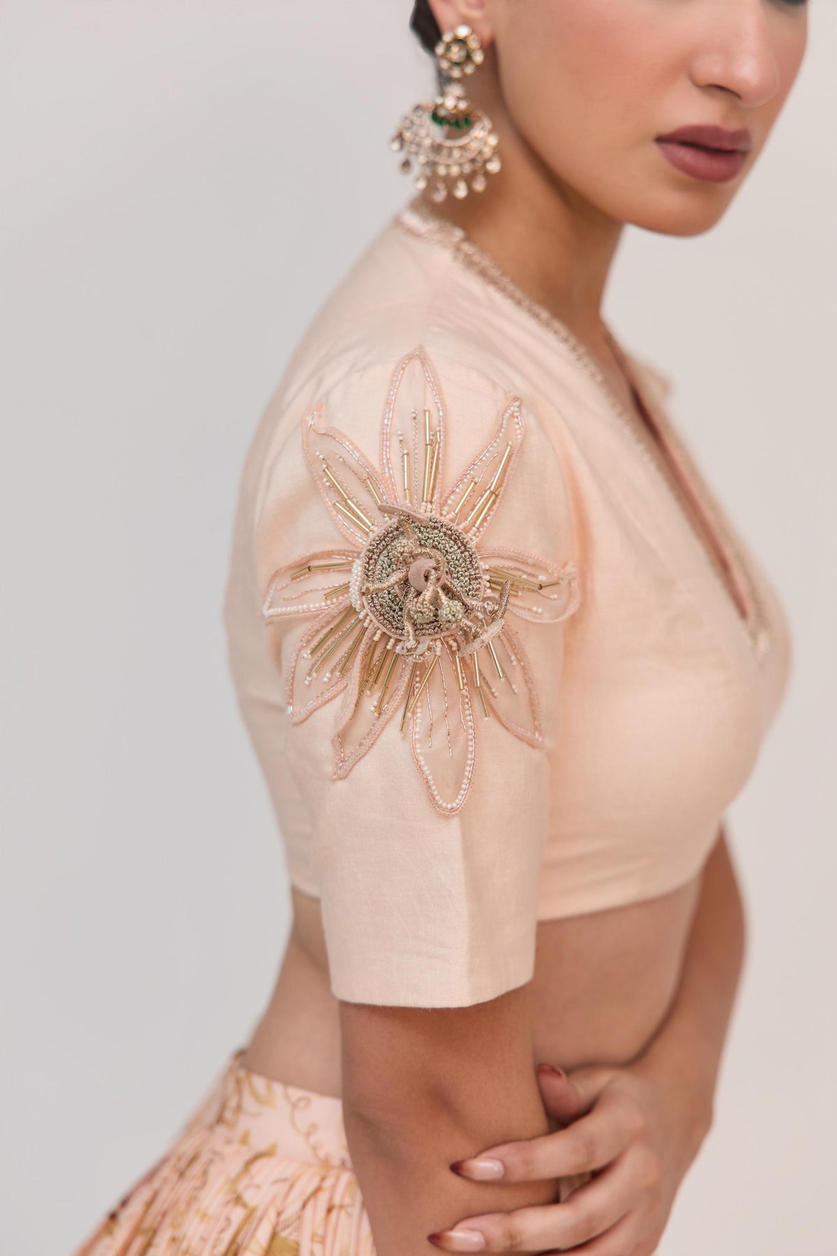 This soft peach lehenga set crafted in bamboo cotton and 35gsm organza brings the delicate beauty of the Krishna Kamal flower to life through intricate digital prints and hand-embellished details. The blouse features subtle embroidery along the neckline and sleeves, adding dimension to its Krishna Kamal–inspired motifs. The ghagra mirrors this narrative with flowing panels of digital print, accentuated by delicate zari faggoting that lends a handcrafted finish. Completing the ensemble, the ethereal 35 gsm organza dupatta carries the same Krishna Kamal inspiration, adorned with hand-embroidered blooms, embroidered edging, and handmade tassels—together creating a look that is both rooted in craft and infused with contemporary elegance.