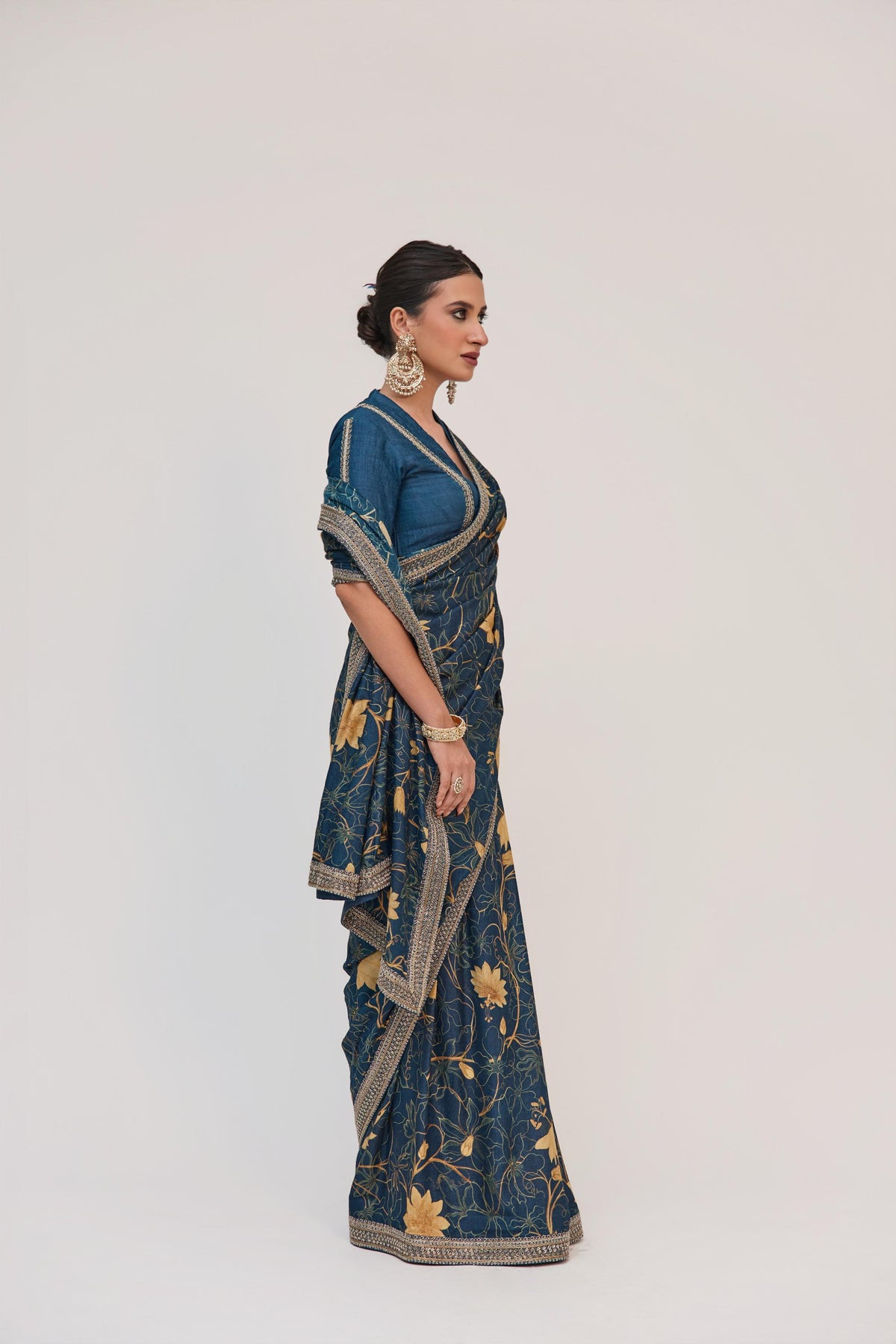 In a luminous shade of royal blue, this munga silk saree unfurls with Krishna Kamal–inspired digital prints, its fluid surface framed by a hand-embroidered zardozi border that adds quiet opulence. The plain munga silk blouse carries the same story through refined zardozi embroidery, echoing the flower’s intricate form. Together, the ensemble balances tradition and artistry—an elegant celebration of print, handwork, and poetic detail.