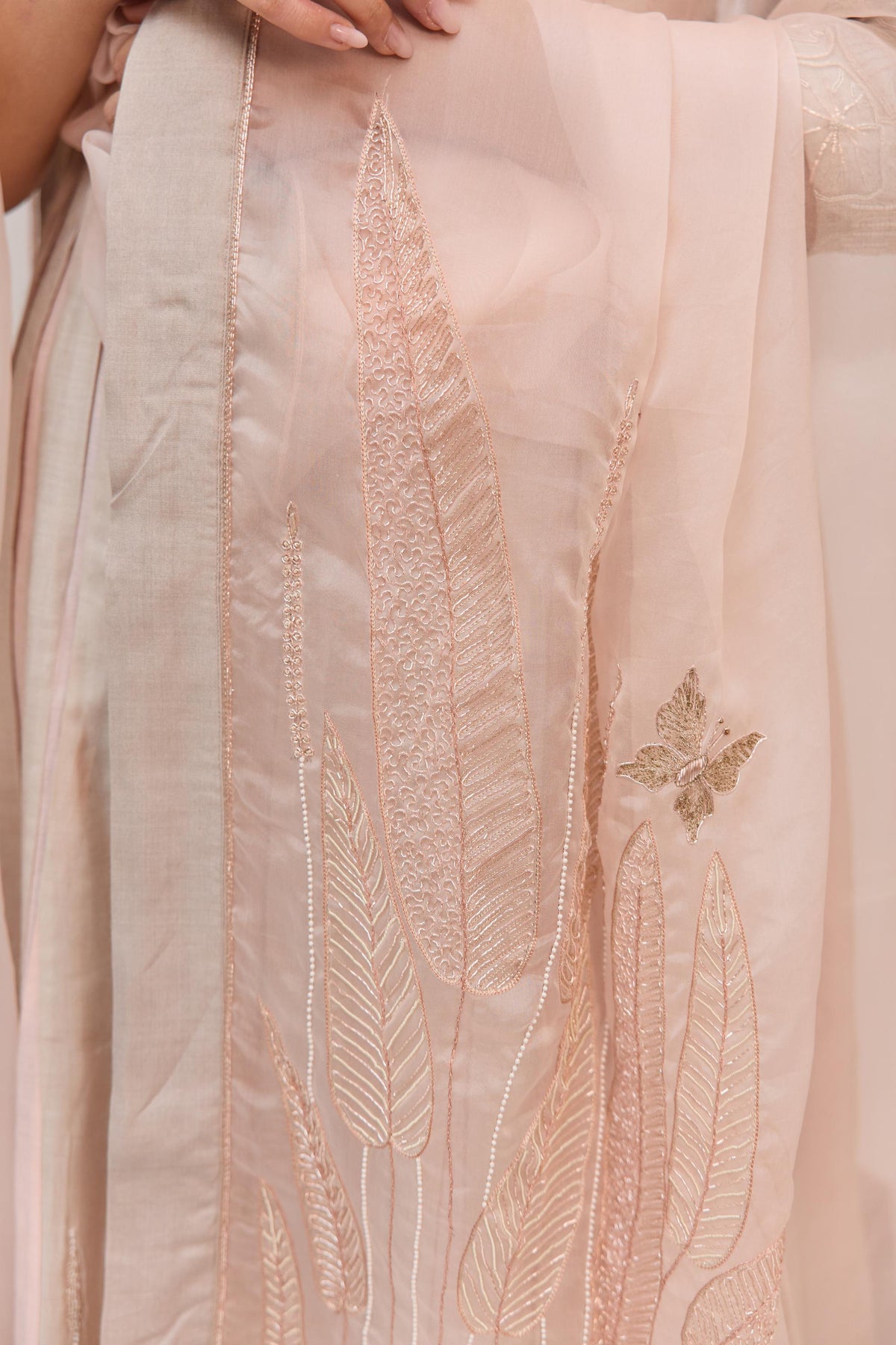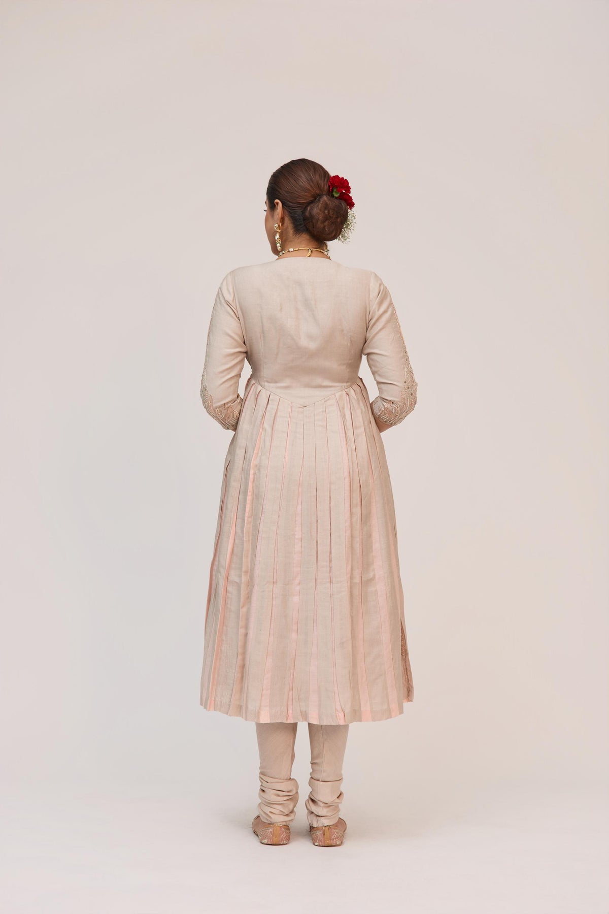 This warm grey munga silk anarkali kurta is enriched with “life in lotus bloom” embroidery, delicately placed along the sleeves and pleats to create a sense of movement and depth. Paired with a solid munga silk churidar, the look remains grounded in tradition while exuding quiet strength. The sheer 35 gsm organza dupatta completes the ensemble with matching swamp-inspired embroidery and lotus-shaped tassels, bringing together elegance, craft, and storytelling in every detail.