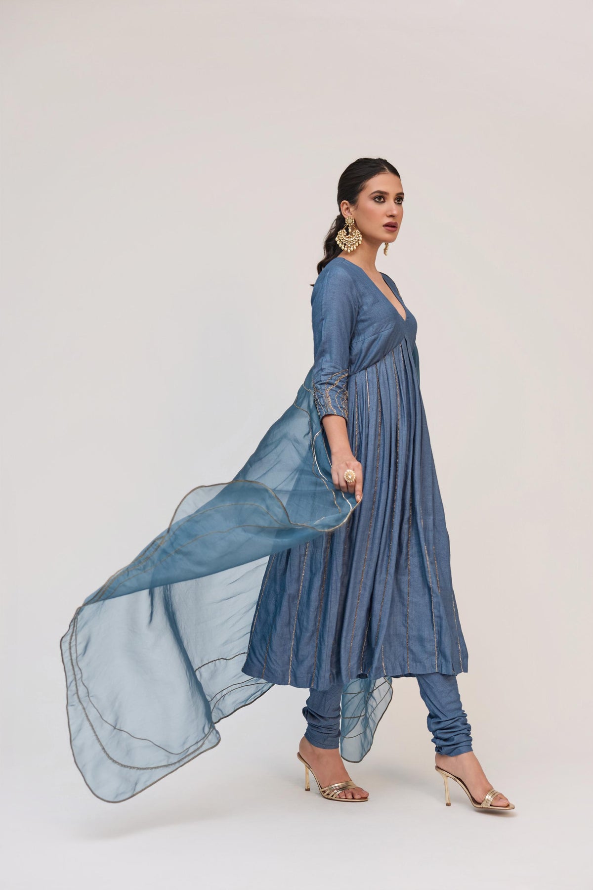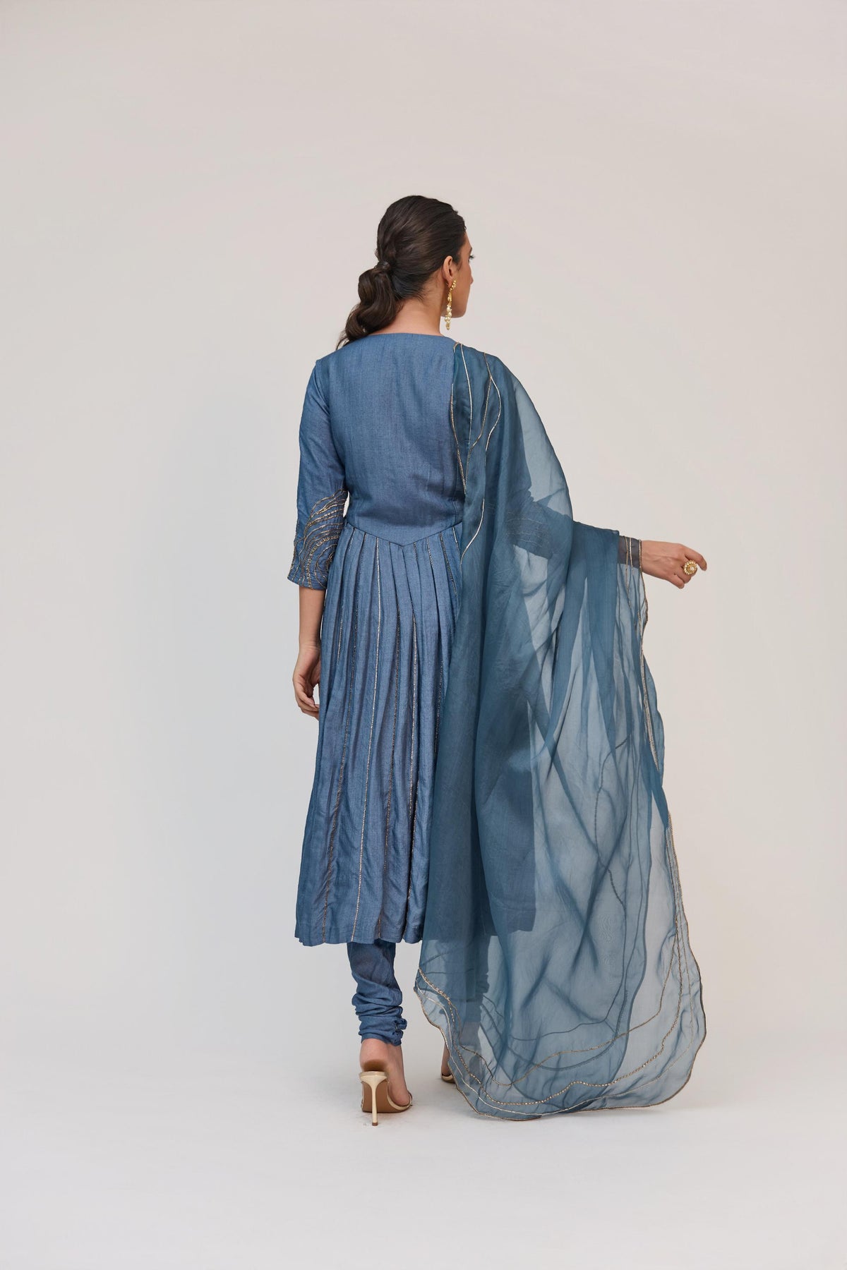 This deep aqua munga silk anarkali kurta captures the poetry of time through embroidery inspired by the cross-section of a tree trunk, placed along the sleeves and body with intricate detail. Paired with a solid churidar for timeless balance, the look is elevated by a 35 gsm organza dupatta, finished with an uneven edge and tree ring–inspired embroidery. The ensemble flows with quiet elegance, blending structure, symbolism, and craft into one harmonious statement.